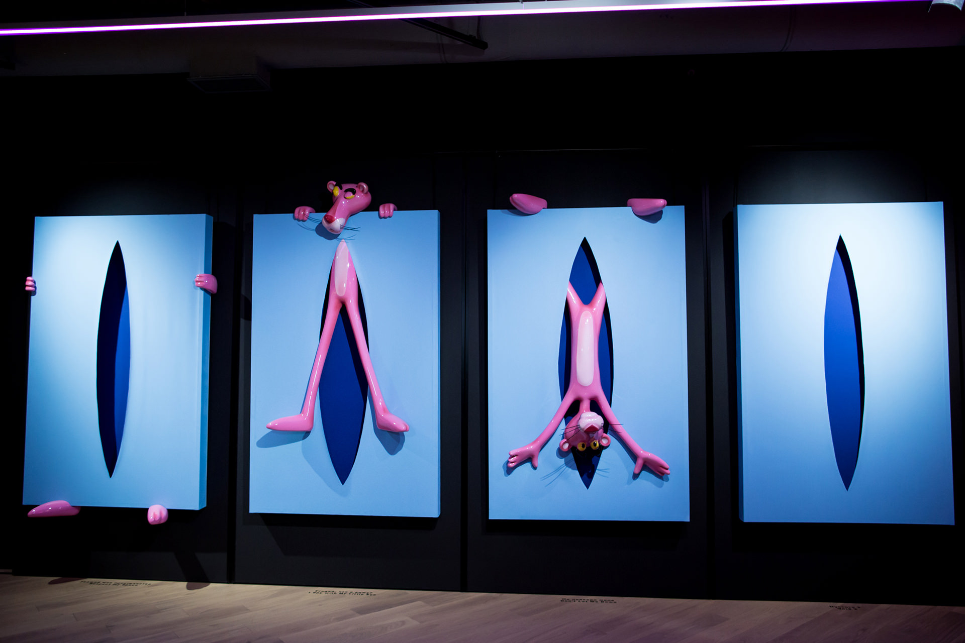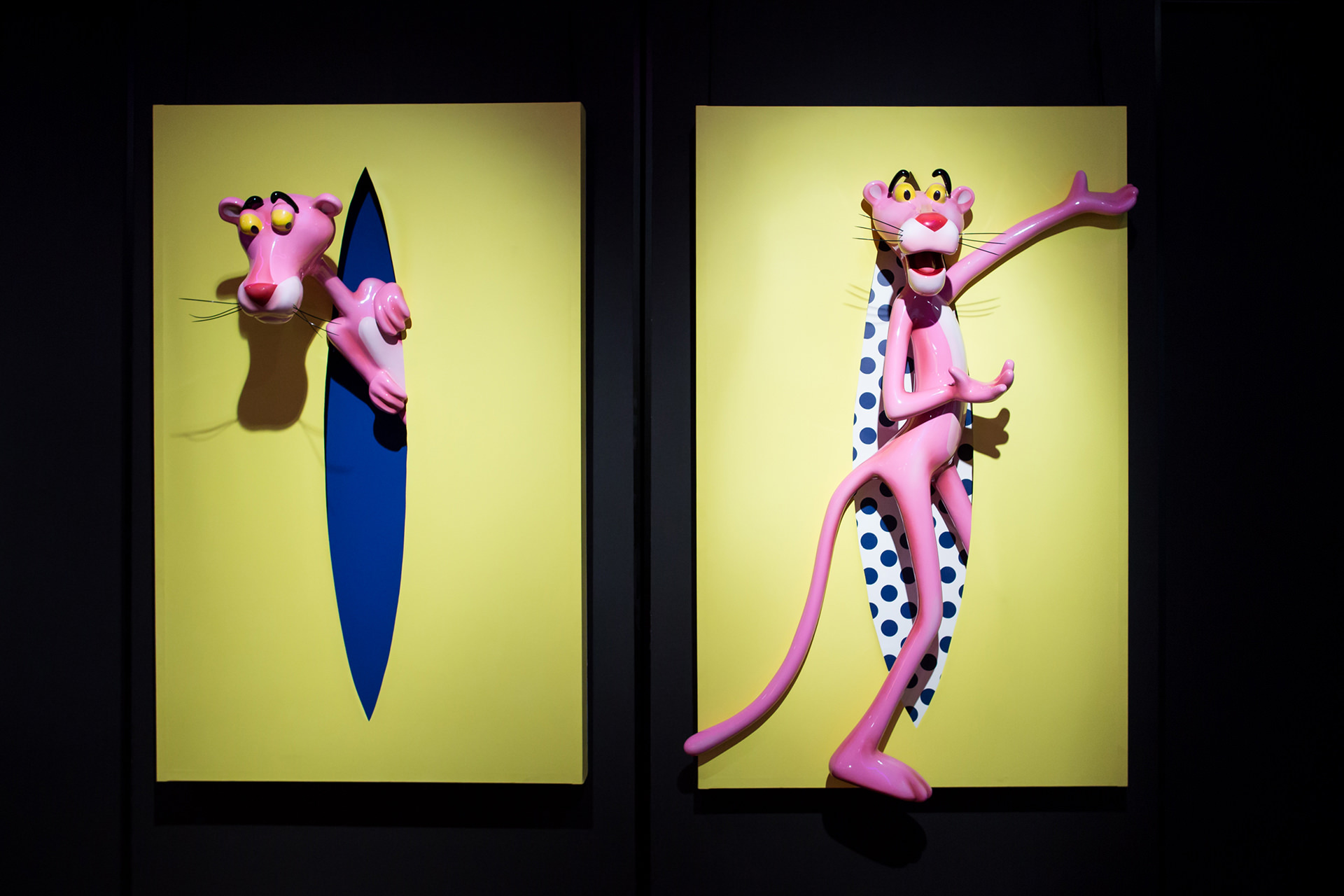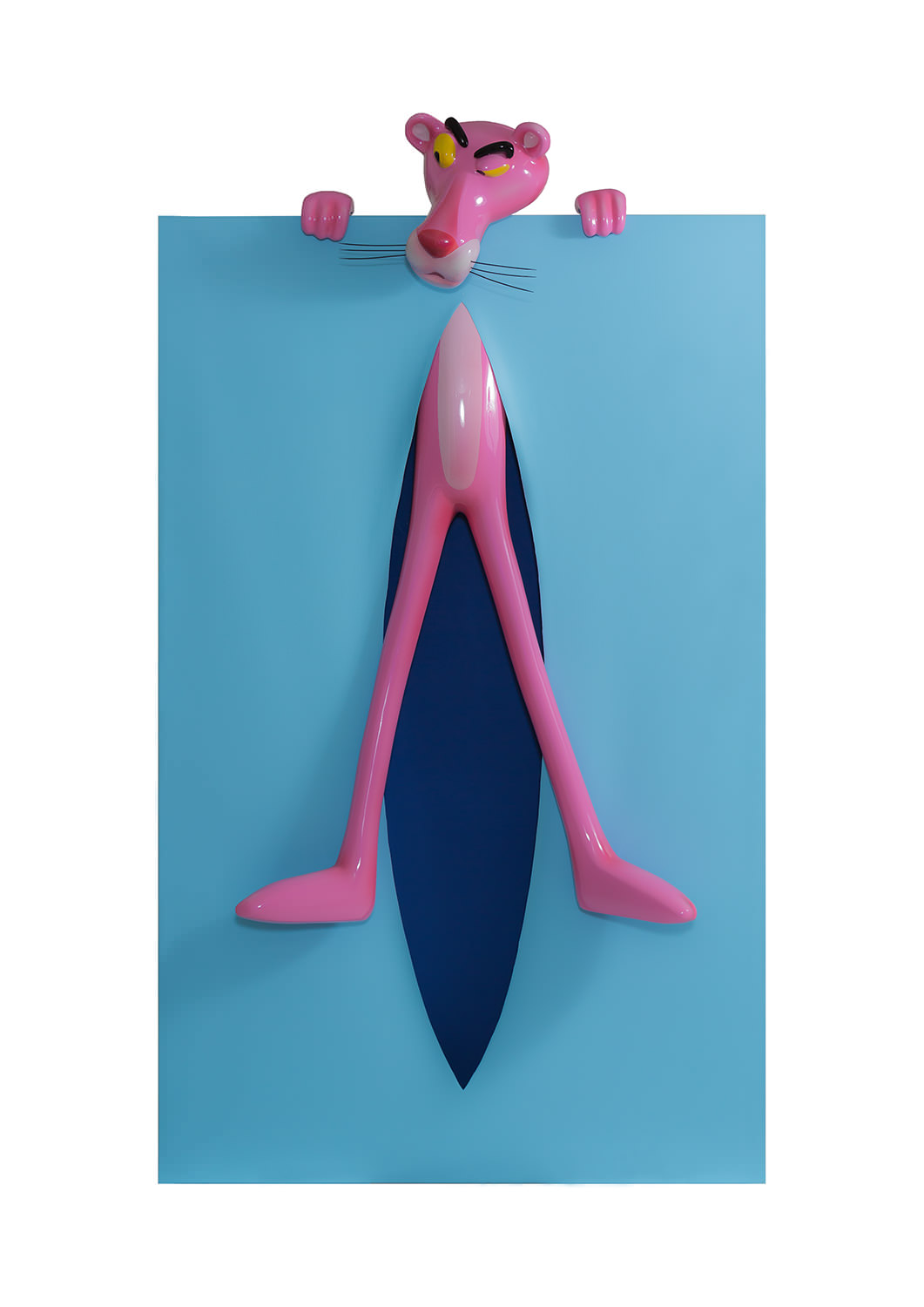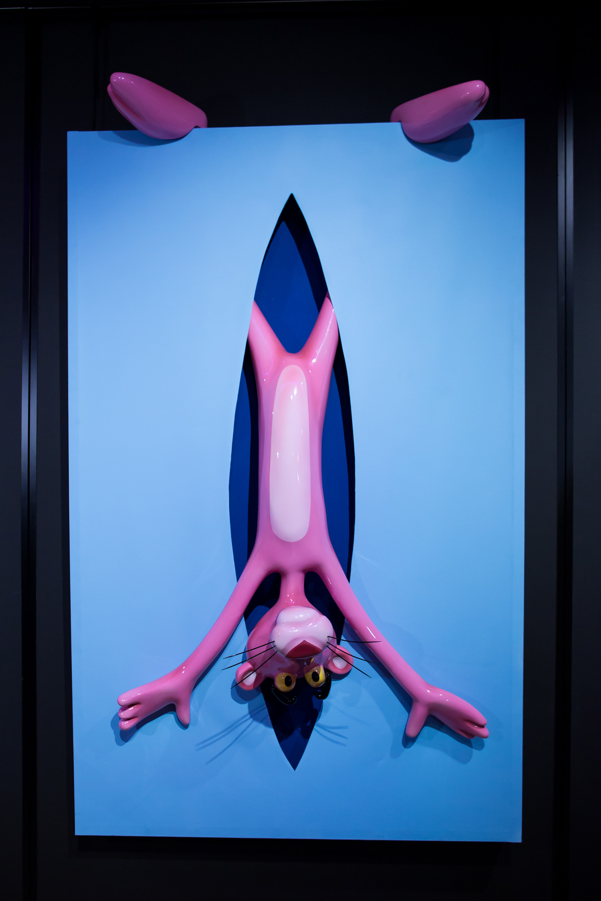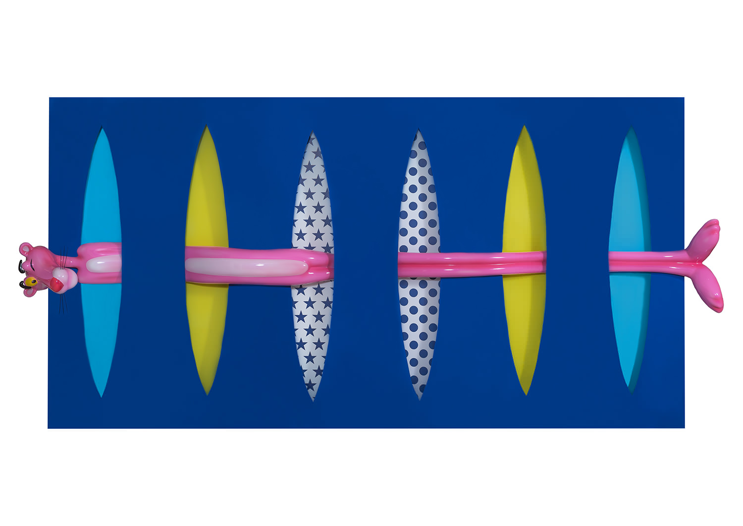Each of the twelve sculptures are arranged into three groups of four, with a dominant colour on the rectangular shape. Dark blue, yellow and light blue differentiate each group and then appear in the interior of the void, firstly in block colours, becoming spots in Perfect Cut, stars in Love you to the Moon and Back, reverting back to two block colours thereafter. It is only when we reach the final and thirteenth installation, Infinity, that all of the colour and pattern variations come together with the Pink Panther interwoven through the entire form. A monumental installation over 3.5 metres long, Infinity is set above and beyond the other twelve sculptures, highlighting the significance of that which it points to.