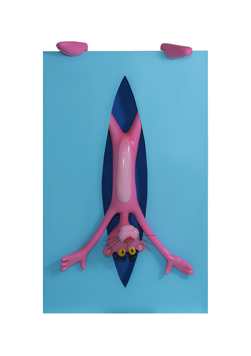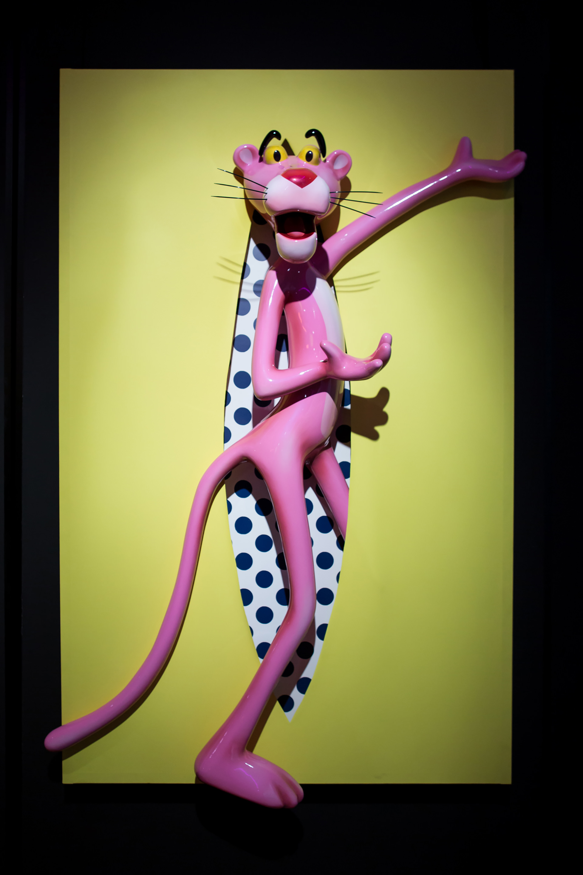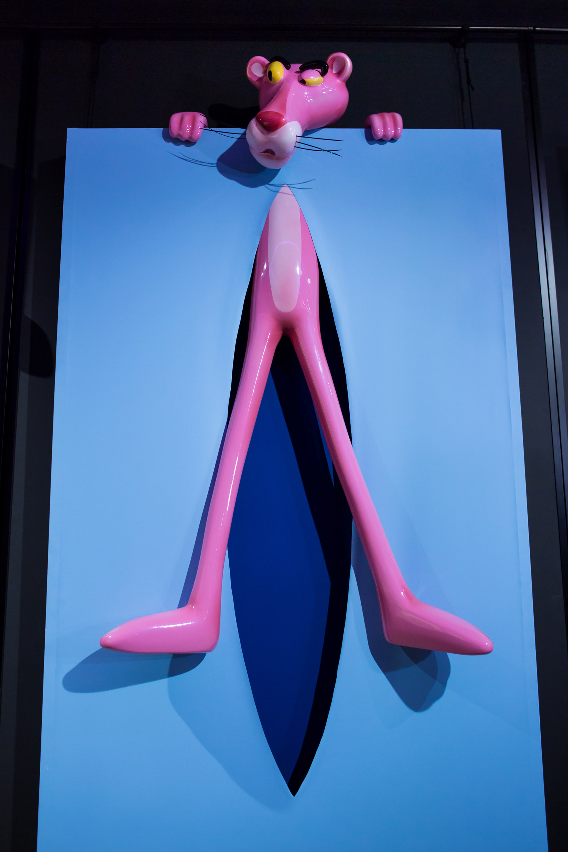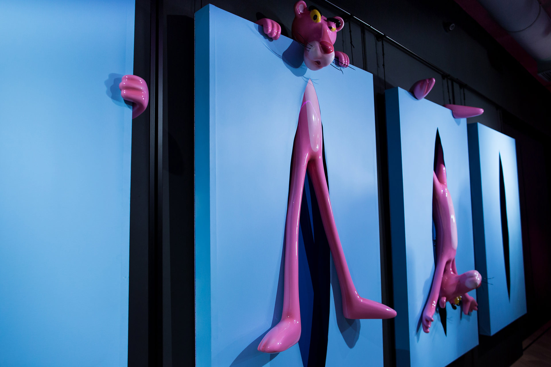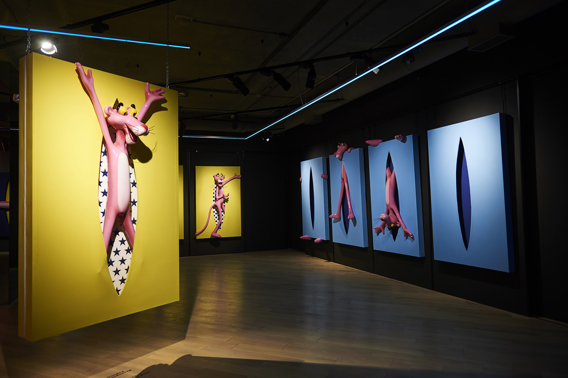 Each of the twelve sculptures are arranged into three groups of four, with a dominant colour on the rectangular shape. Dark blue, yellow and light blue differentiate each group and then appear in the interior of the void, firstly in block colours, becoming spots in Perfect Cut, stars in Love you to the Moon and Back, reverting back to two block colours thereafter. It is only when we reach the final and thirteenth installation, Infinity, that all of the colour and pattern variations come together with the Pink Panther interwoven through the entire form. A monumental installation over 3.5 metres long, Infinity is set above and beyond the other twelve sculptures, highlighting the significance of that which it points to.