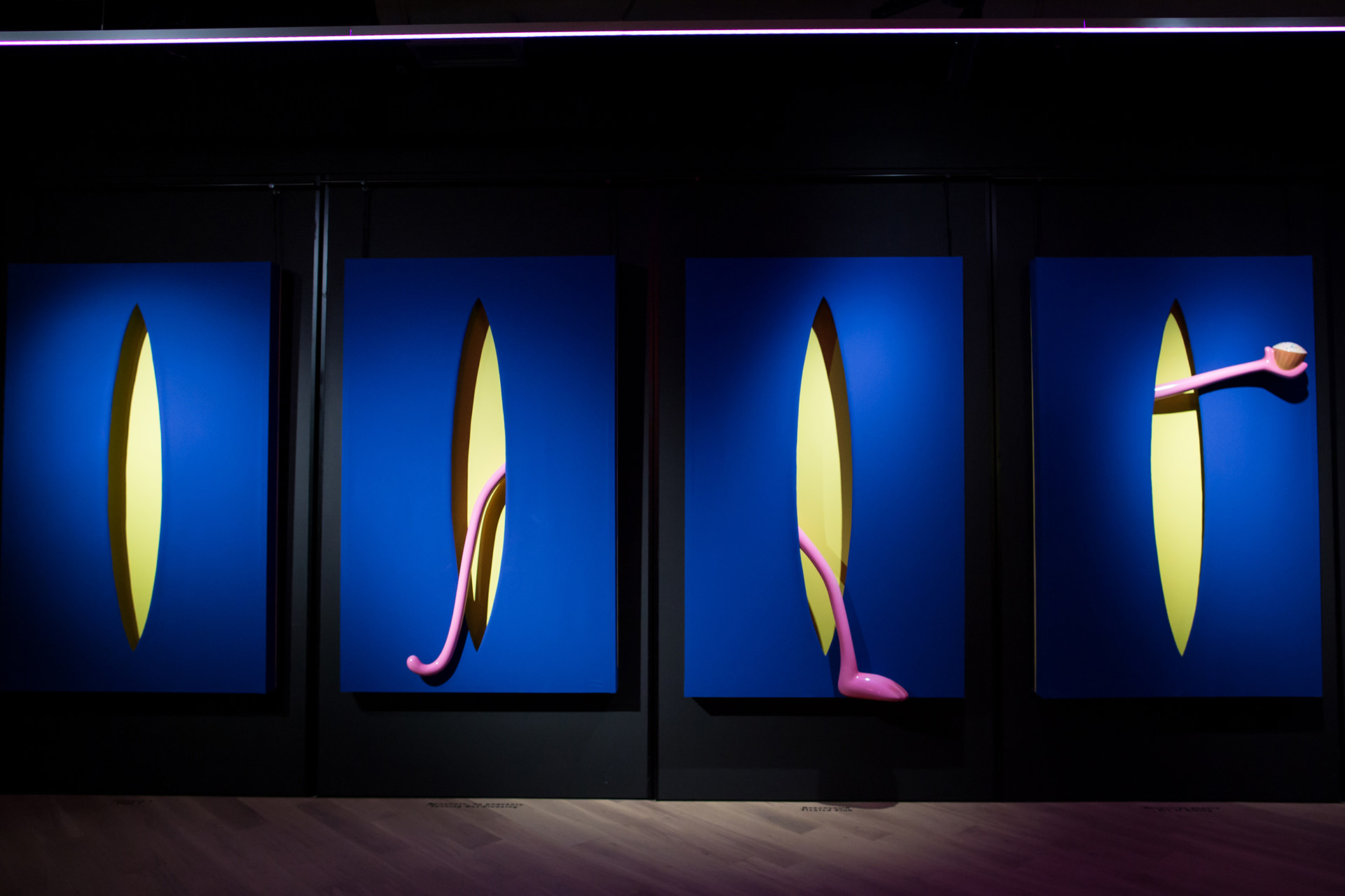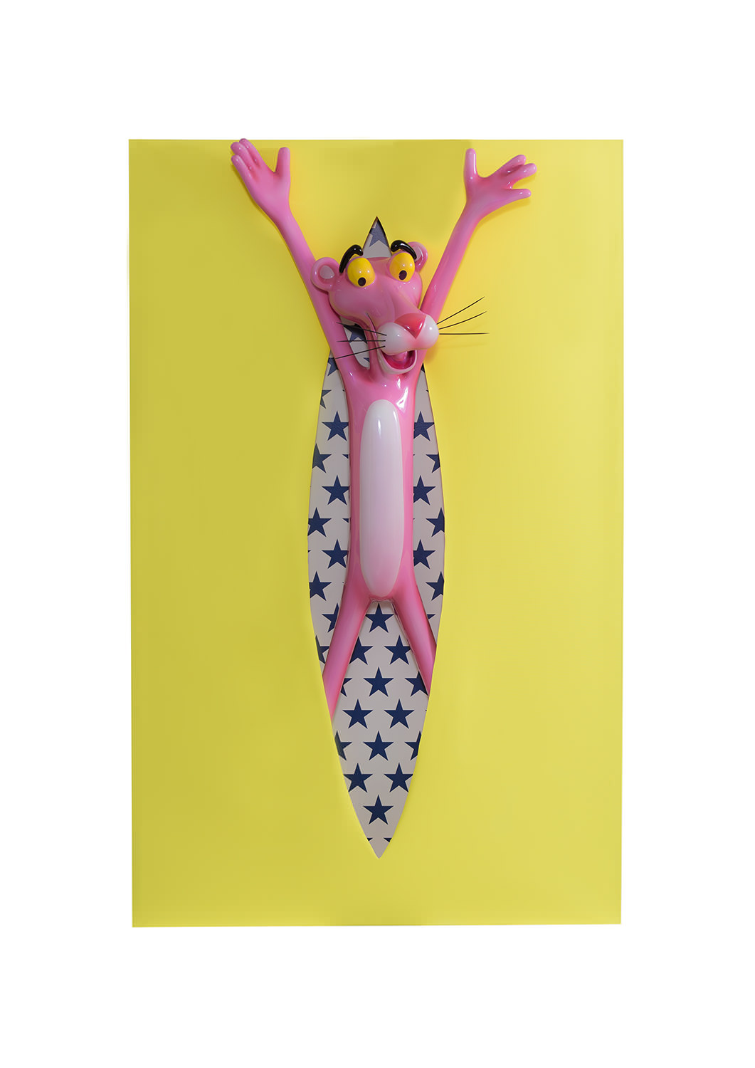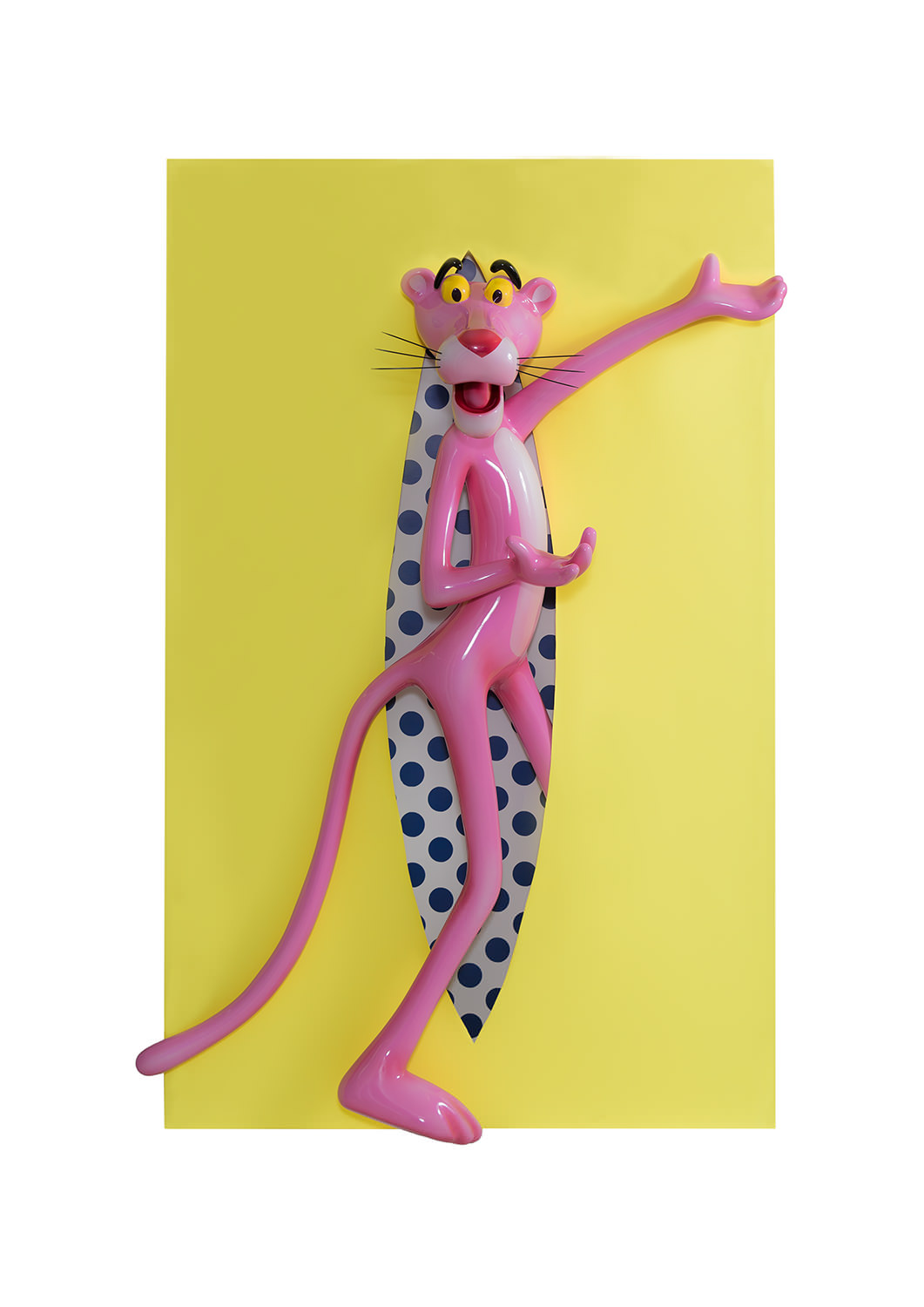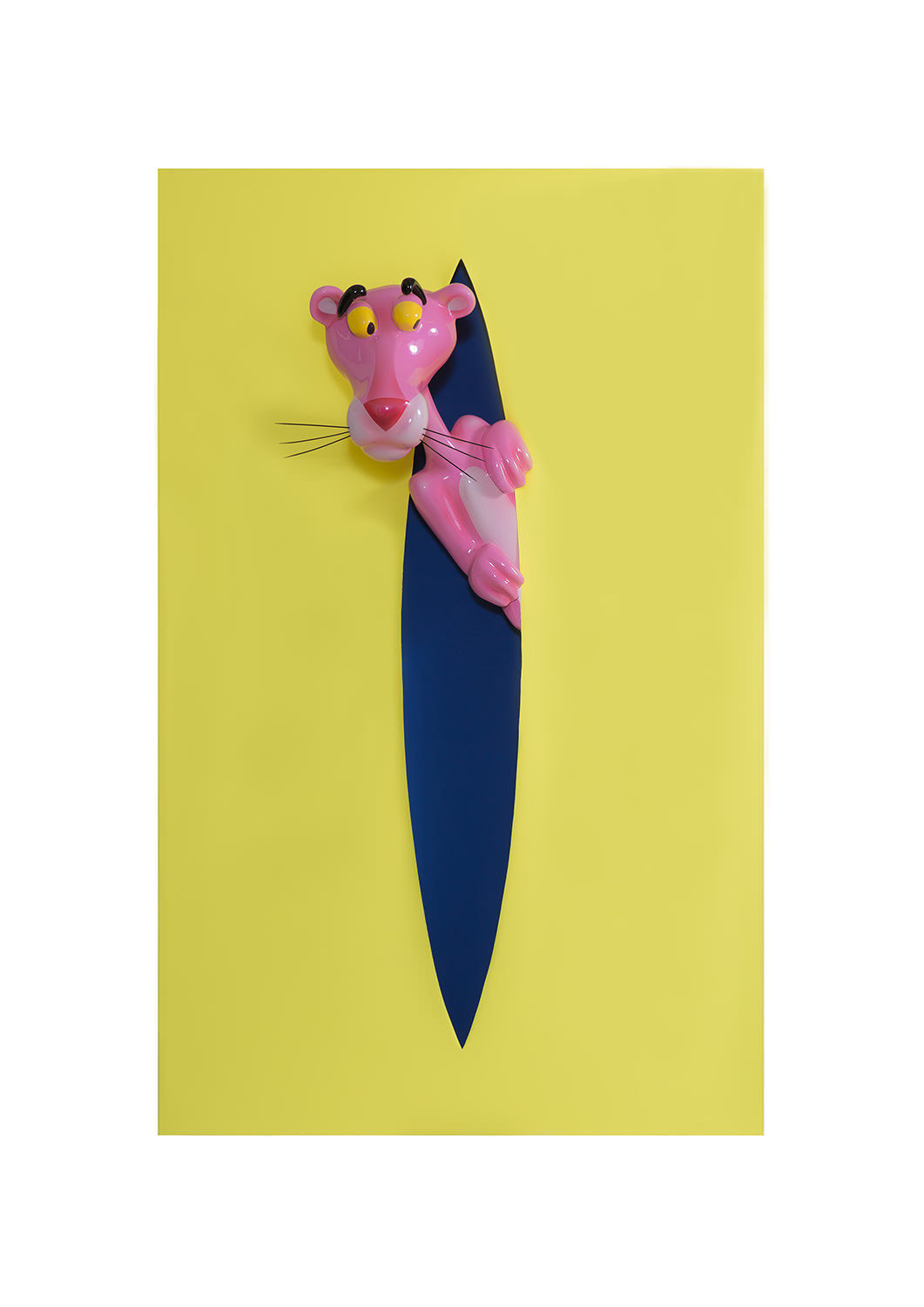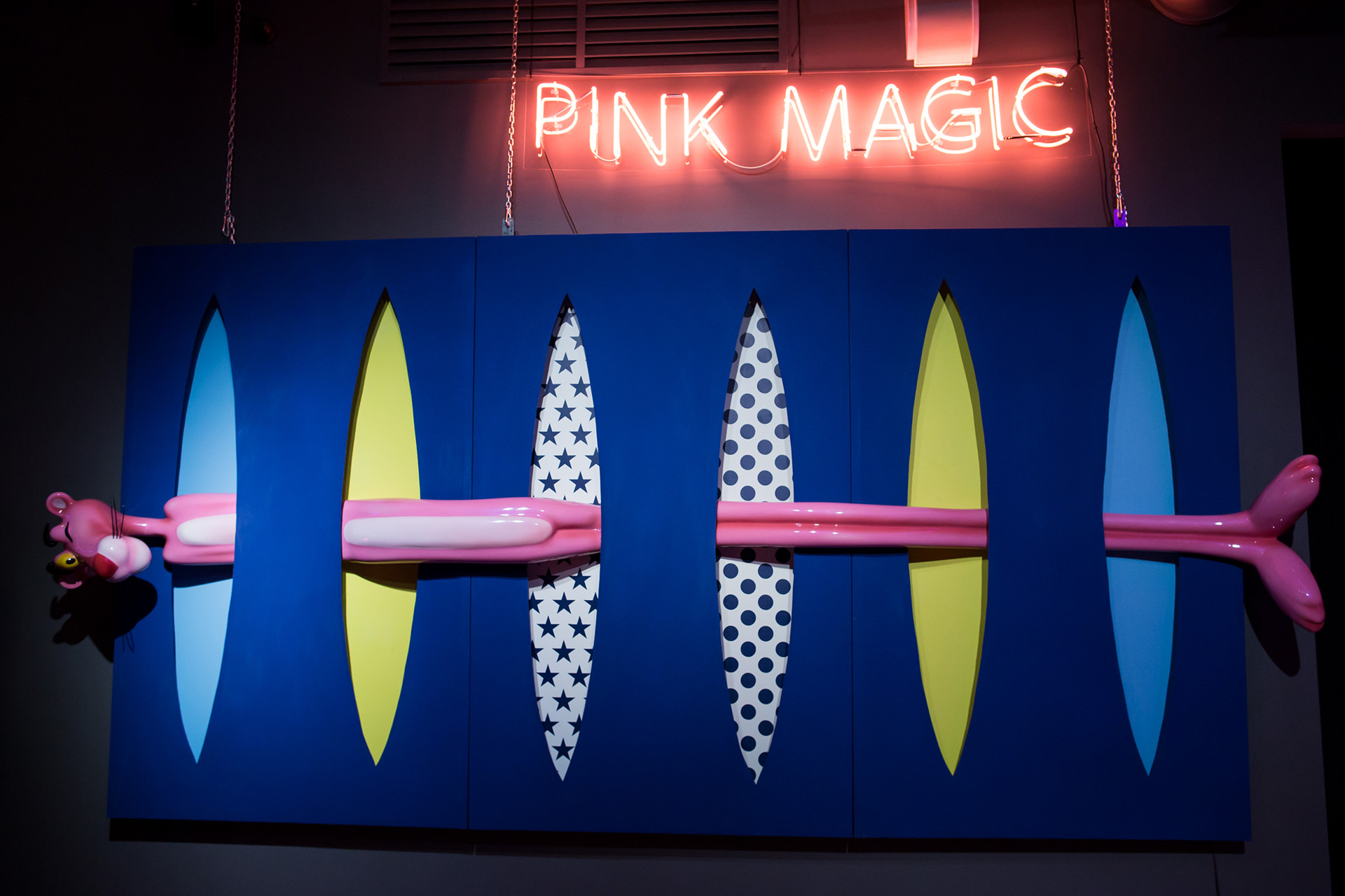Each of the twelve sculptures are arranged into three groups of four, with a dominant colour on the rectangular shape. Dark blue, yellow and light blue differentiate each group and then appear in the interior of the void, firstly in block colours, becoming spots in Perfect Cut, stars in Love you to the Moon and Back, reverting back to two block colours thereafter. It is only when we reach the final and thirteenth installation, Infinity, that all of the colour and pattern variations come together with the Pink Panther interwoven through the entire form. A monumental installation over 3.5 metres long, Infinity is set above and beyond the other twelve sculptures, highlighting the significance of that which it points to.