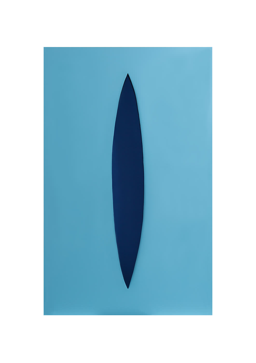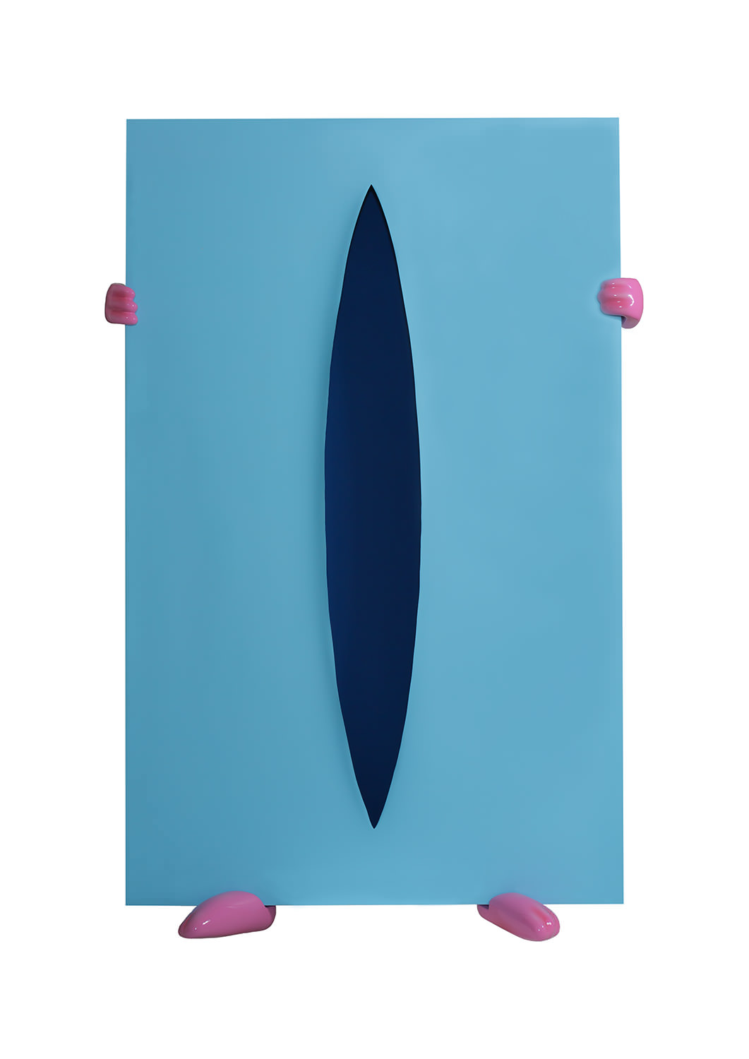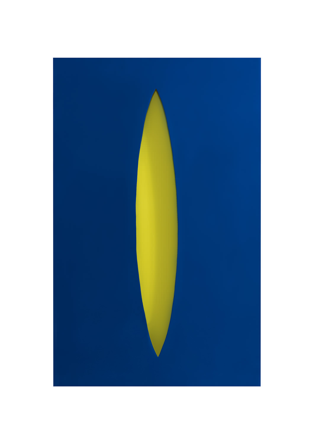 The void in the centre of each sculpture, symbolic of the feminine, cuts through to the background revealing a deep colour of an inner dimension. The space created by the void is populated by suggestion, recalling Anish Kapoor’s void, and is juxtaposed by the apparent flat rectangularity of the sculpture surrounding it. Here, the mysterious properties of space created by form are explored, loosely alluding to the abstract expressionism of Lucio Fontana. By removing mass, space is created, yet this is paradoxical, for in the presence of space, form can be manifested. The void becomes infinity with its endless possibilities, manifestations and creations; an aspect of the magical.
