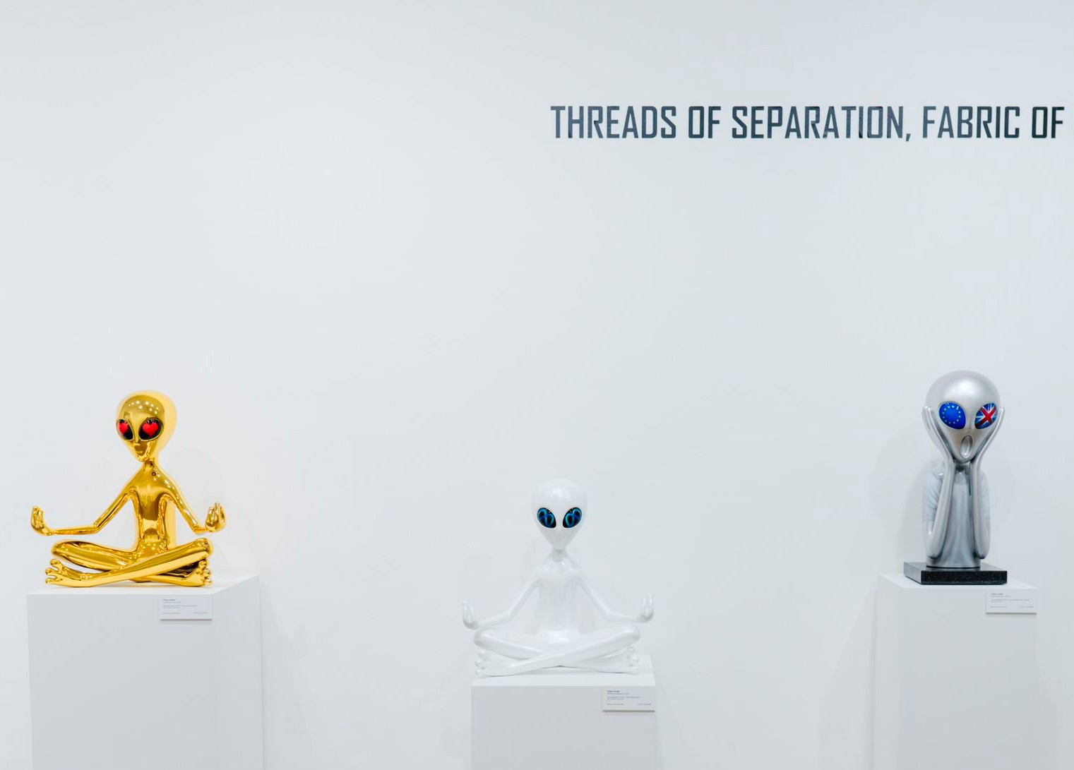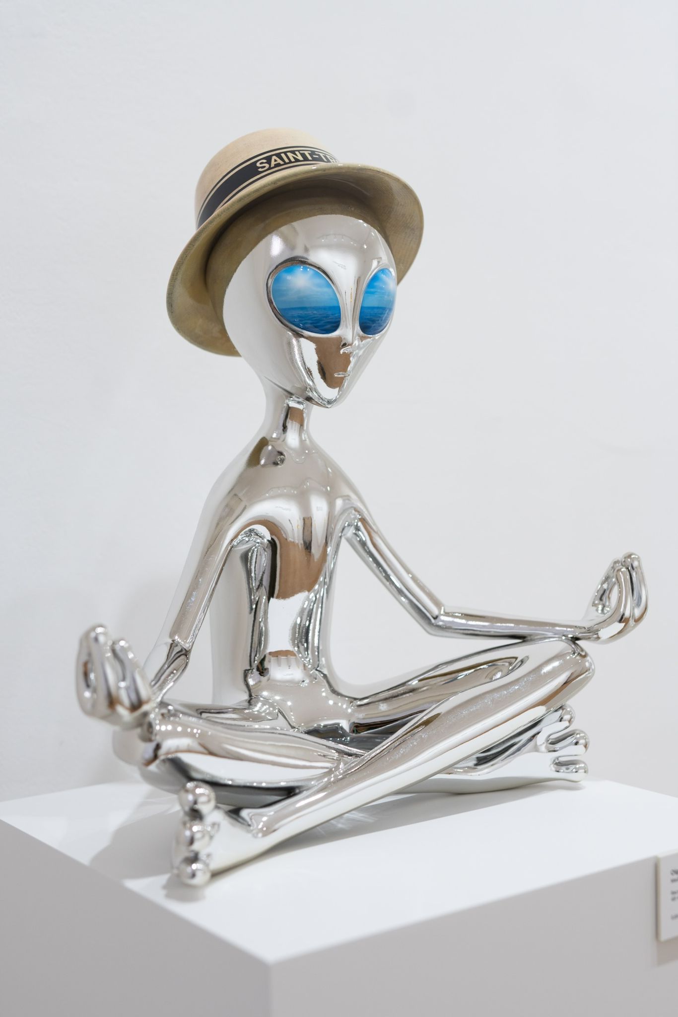 By representing her aliens in these contrasting postures, Lomaka aligns with the tradition of early portrayals of aliens in Western culture, such as H.G. Wells’ “The War of the Worlds” (1897), where these visitors served as reflections of societal fears and tensions. The dual composition of the sculptures enables viewers to transform the fears seen in the screamer’s eyes into a meditative state and vice versa. Yet, it’s crucial to remember that these sculptures are aliens, not humans, introducing an element of estrangement that makes the series both critical of the human condition and self-reflective.