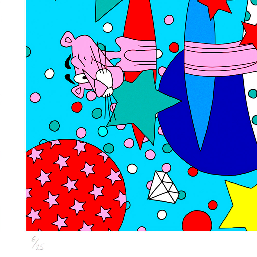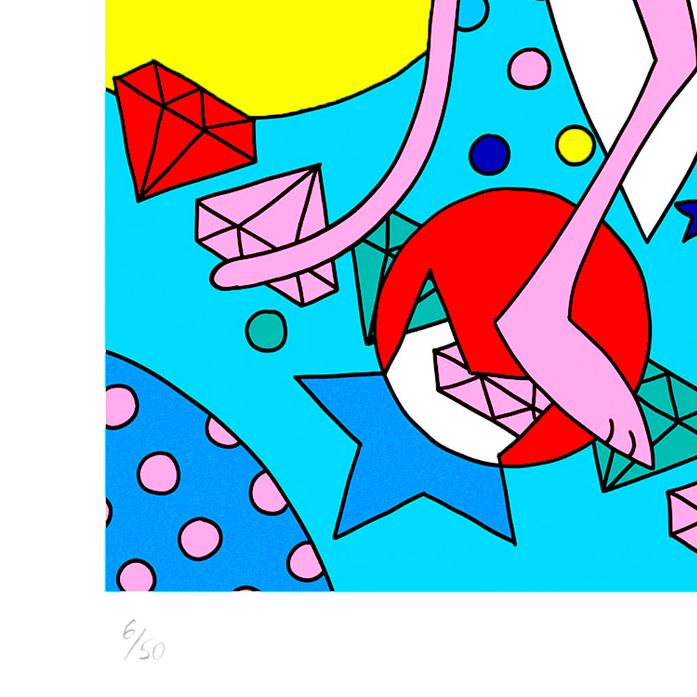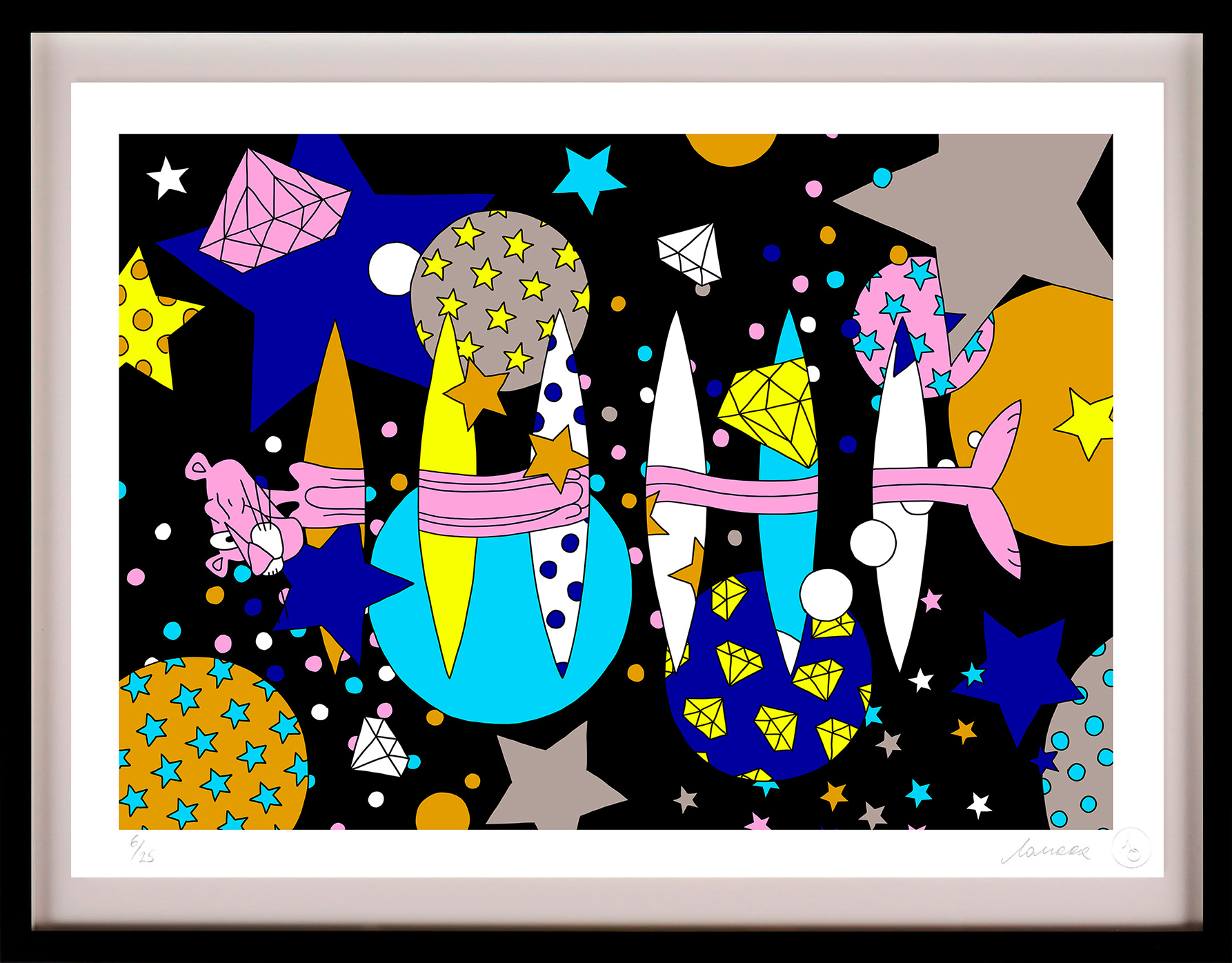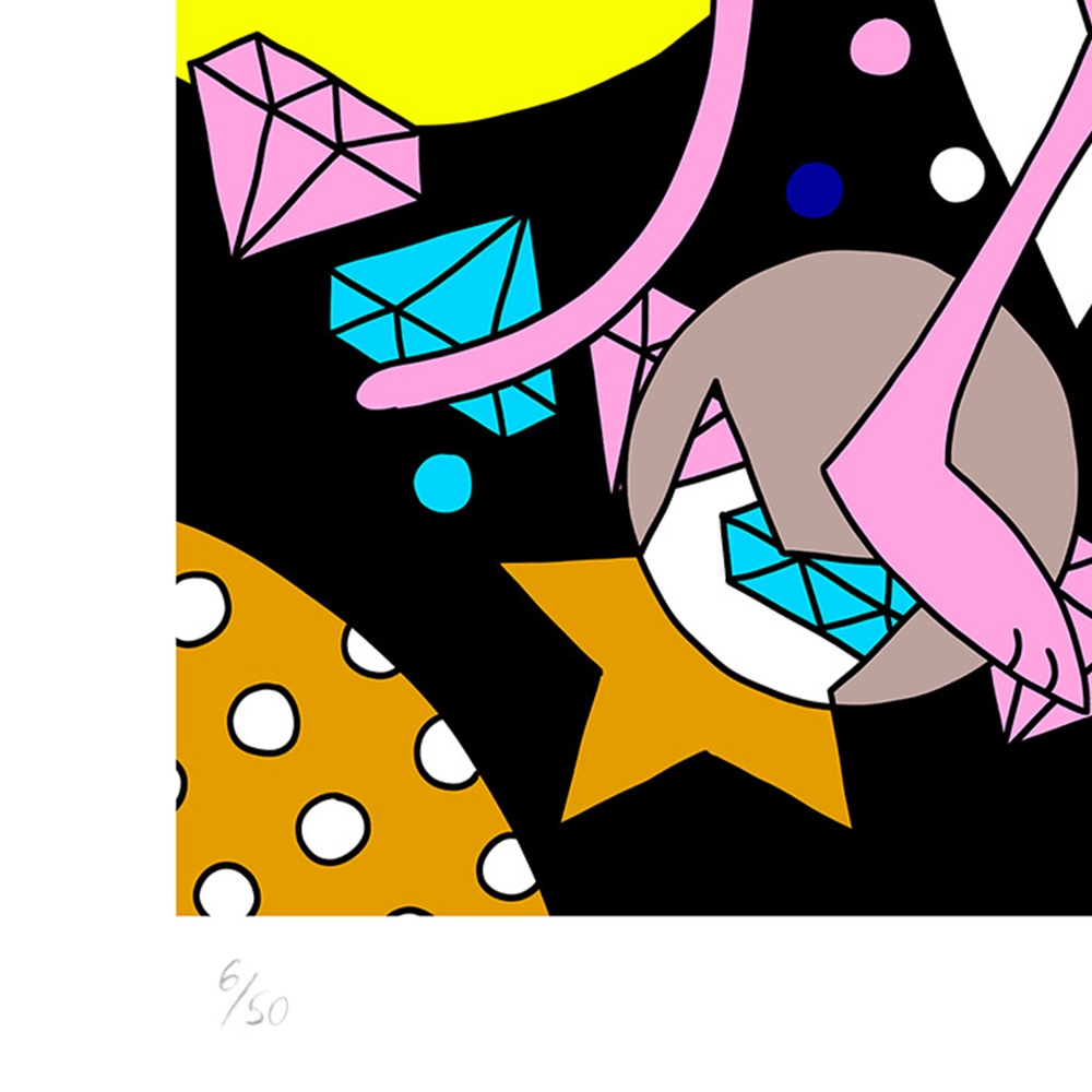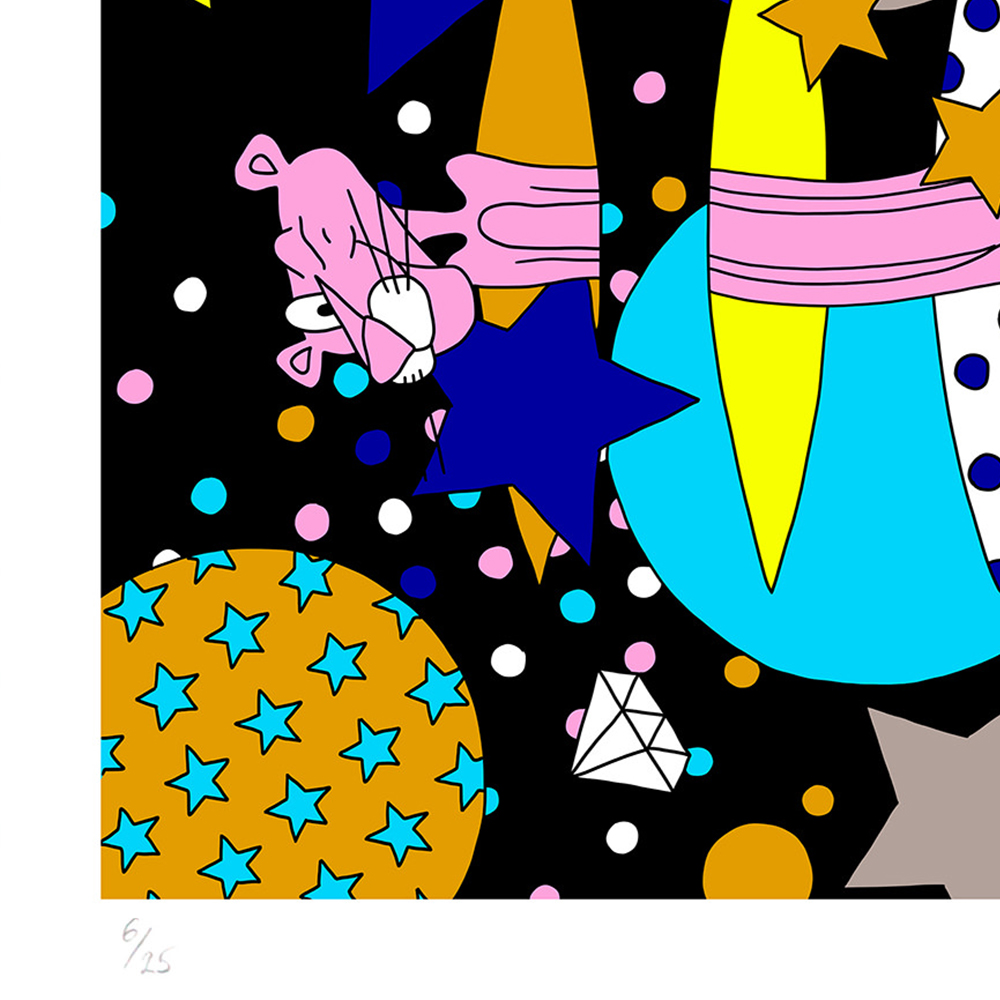 With her trademark pop of colour and little bit of pink panther star sprinkled magic, the new print series aims to lift our spirits by brightening even the gloomiest of galaxies. The patterned designs aim to play with perspective of what’s an illusion and what’s real, a common thread in Lomaka’s work.