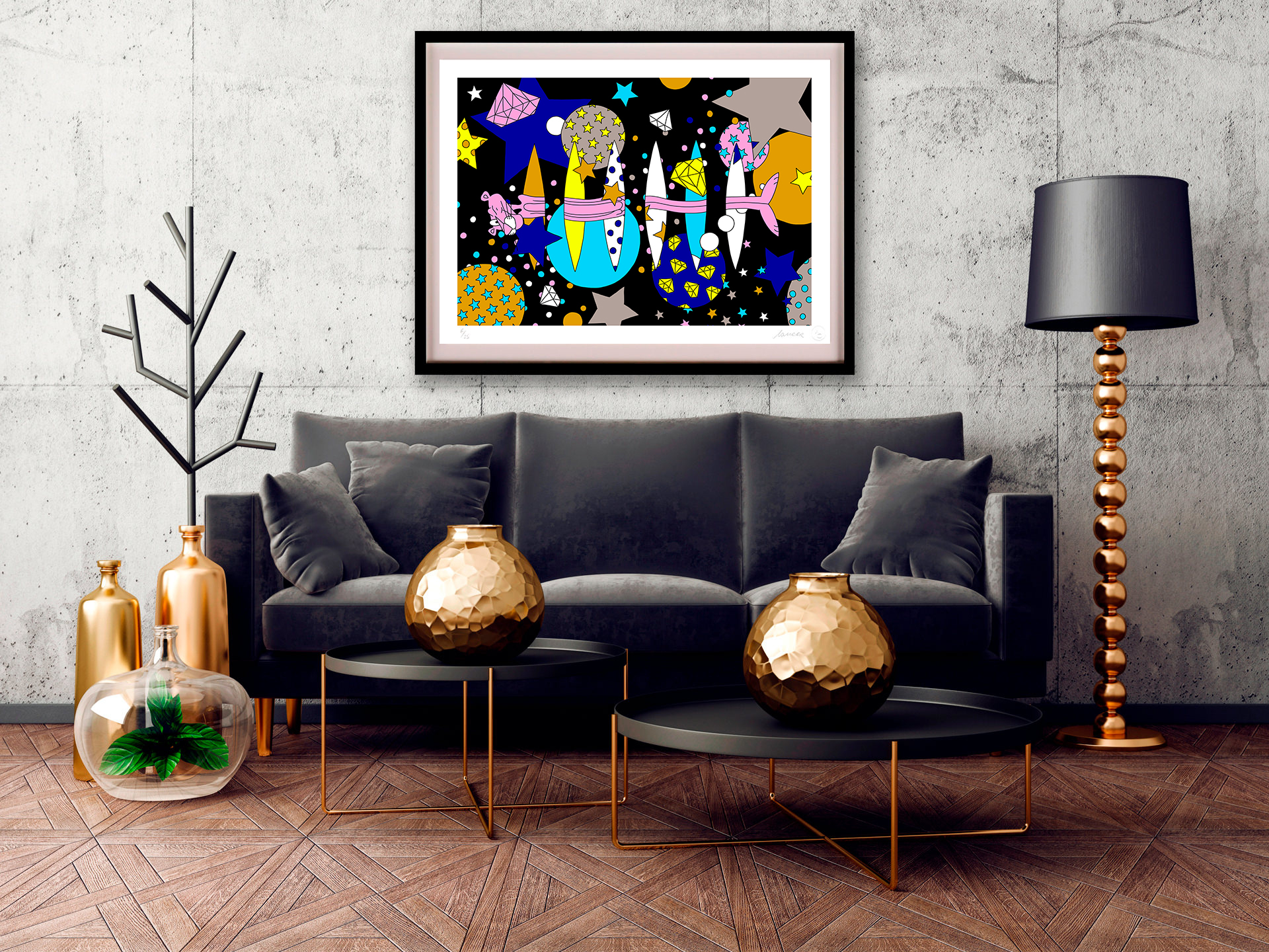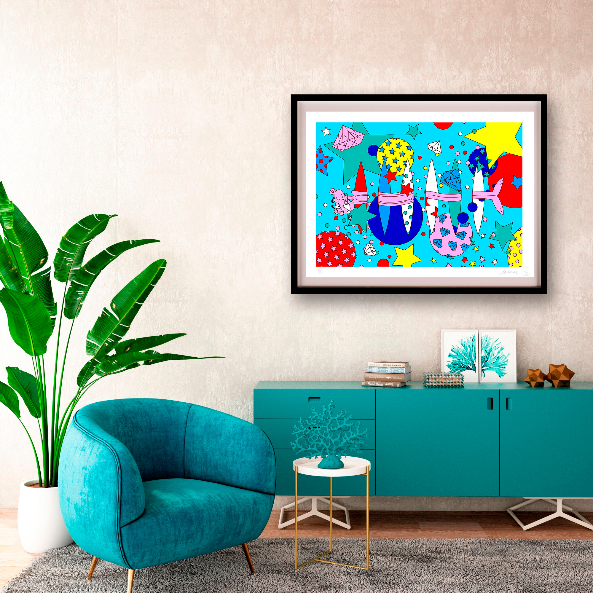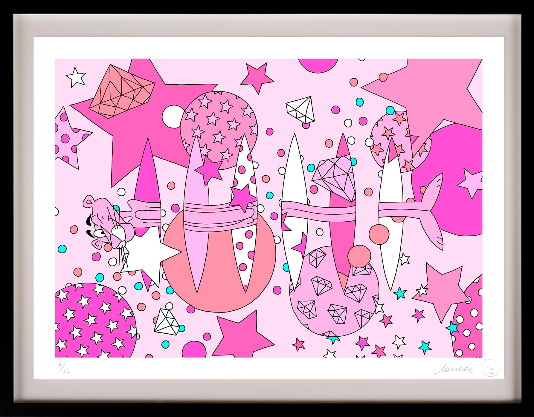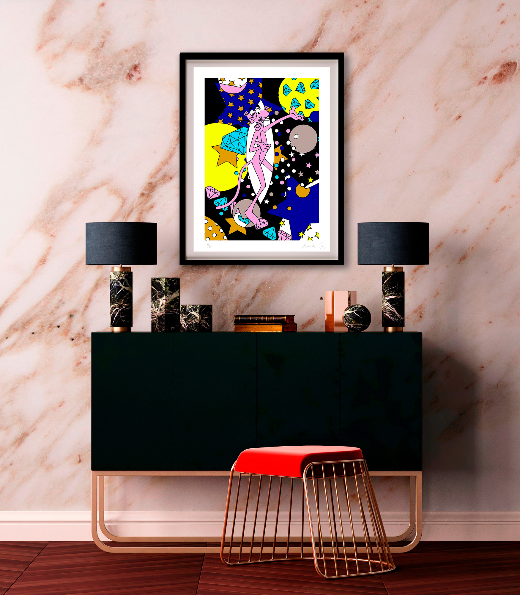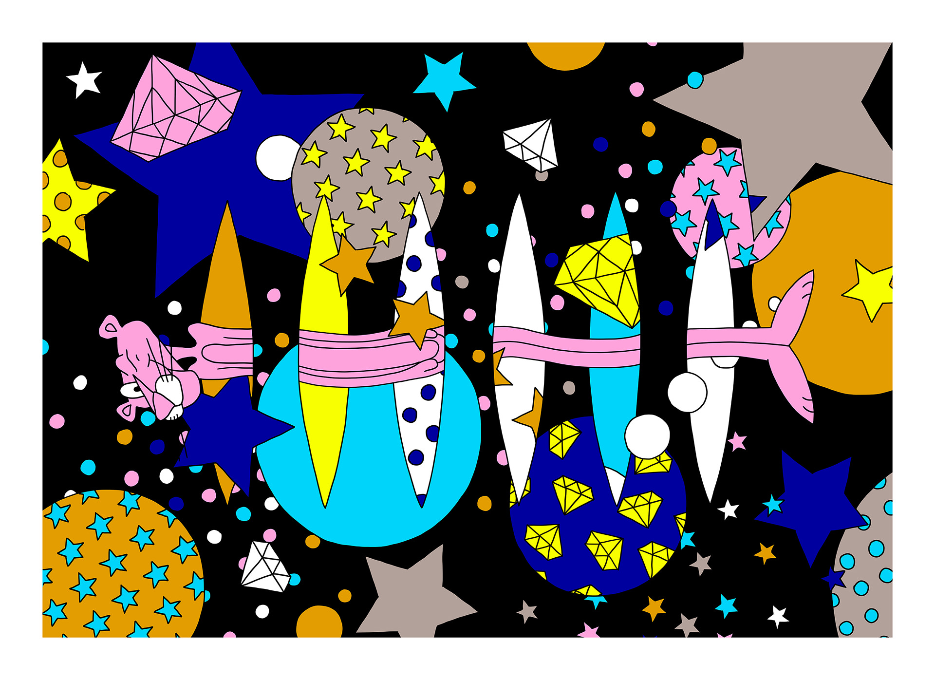 With her trademark pop of colour and little bit of pink panther star sprinkled magic, the new print series aims to lift our spirits by brightening even the gloomiest of galaxies. The patterned designs aim to play with perspective of what’s an illusion and what’s real, a common thread in Lomaka’s work.