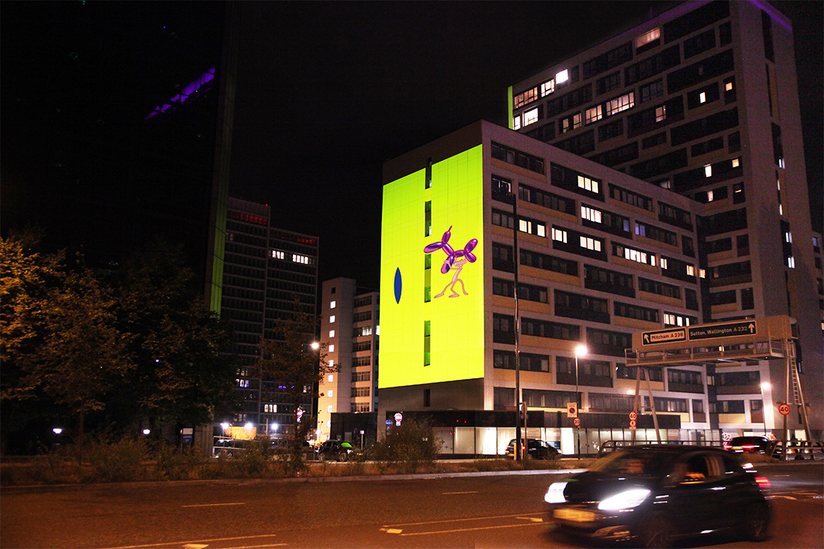 Pink Magic video installation lit up the iconic Innova development in Croydon at the White Party, in homage to Jeff Koon’s 1988 Pink Panther. The film was visible from all the streets surrounding the building. Using humour and colourful montage, the artist also hinted at some other notable stars — Fontana, Magritte and Warhol.